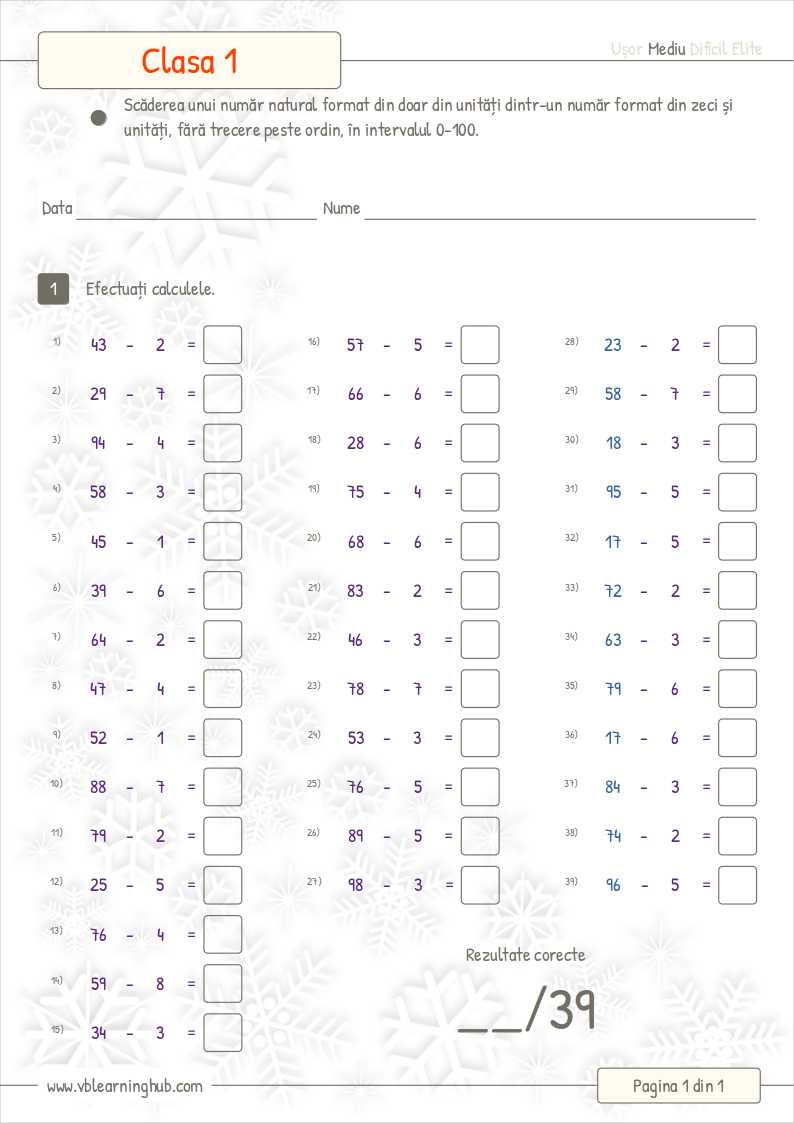 Clasa 1. Scăderea unui număr natural format din unități, dintr-un număr format din zeci și unități, fără trecere peste ordin 0-100. bvaleriu10 ianuarie 2023Clasa 1, Math Worksheets Navigare în articole PrecedentUrmător Descarcă fișa Răspunsuri / Answers Download worksheet Partajează asta: Dă clic pentru a partaja pe X(Se deschide într-o fereastră nouă) X Dă clic pentru a partaja pe Facebook(Se deschide într-o fereastră nouă) Facebook Apreciază Încarc... Similare