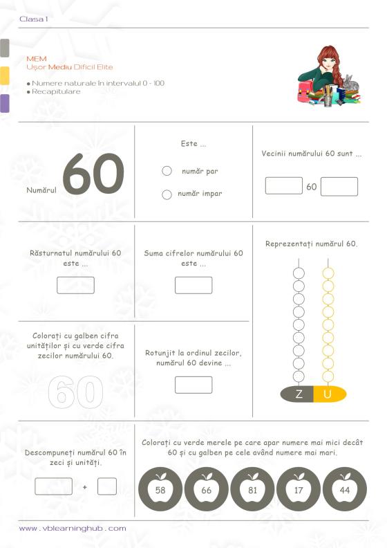Clasa 1. Numere naturale 0-100. Fișă de lucru. Recapitulare. Numărul 60