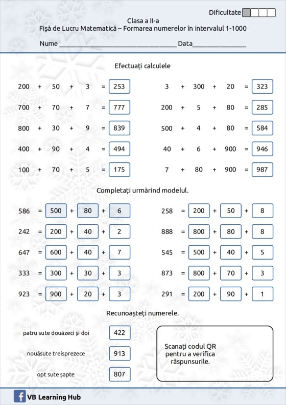 Clasa a II-a. Fișă de lucru Matematică. Formarea numerelor în intervalul 1-1000.