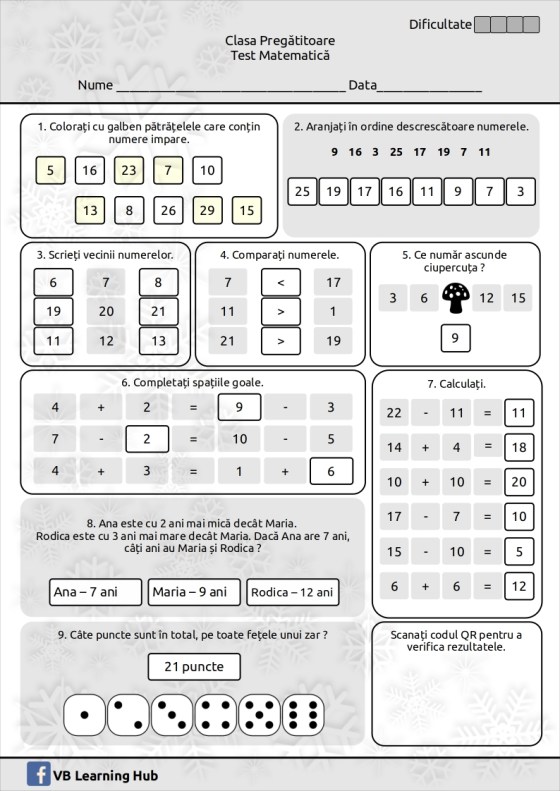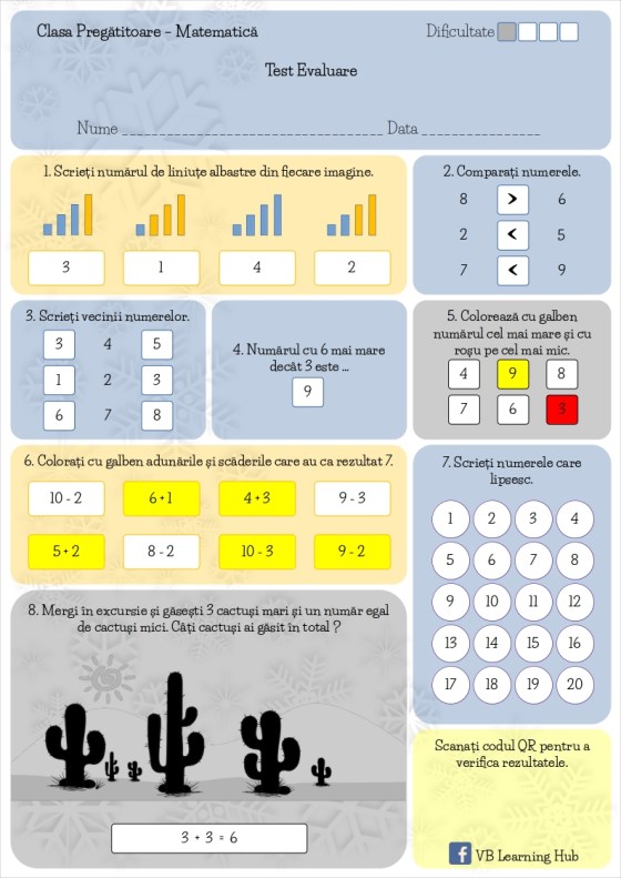 Clasa Pregătitoare. Test Matematică. Recapitulare.