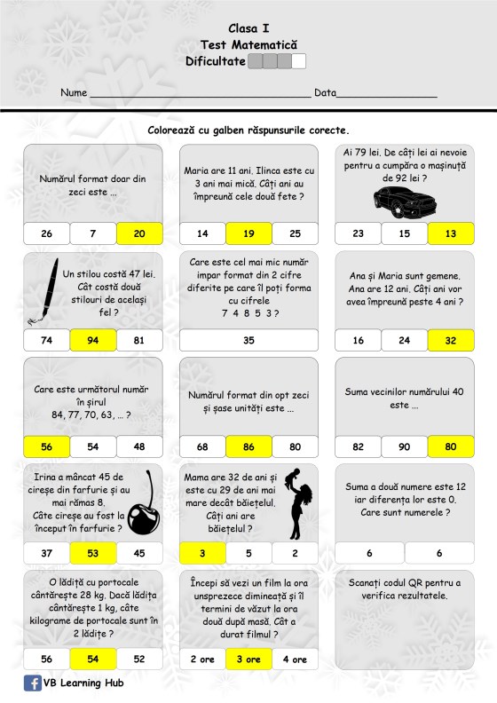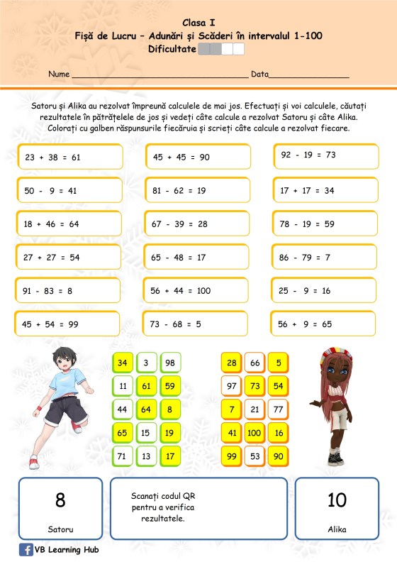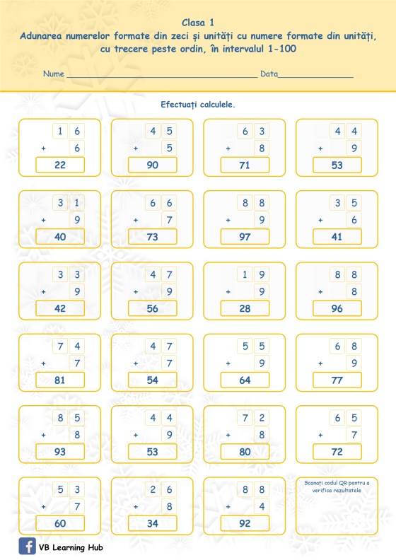Clasa I. Adunarea numerelor formate din zeci și unități cu numere formate din unități, cu trecere peste ordin, în intervalul 1-100.