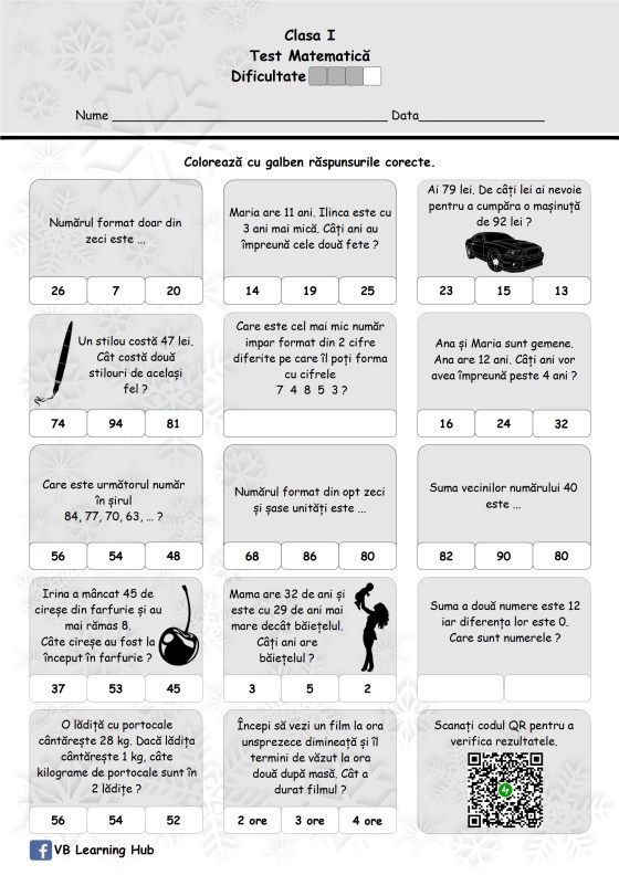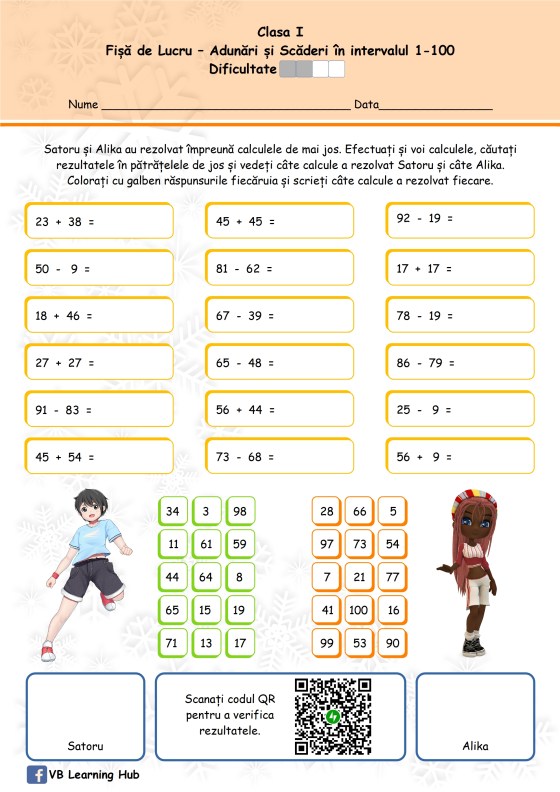 Clasa I. Adunarea numerelor formate din zeci și unități cu numere formate din unități, cu trecere peste ordin, în intervalul 1-100.