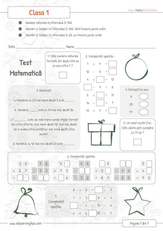 Clasa Pregătitoare. Test Matematică. Adunări și Scăderi 0-10. Numere naturale 0-31.