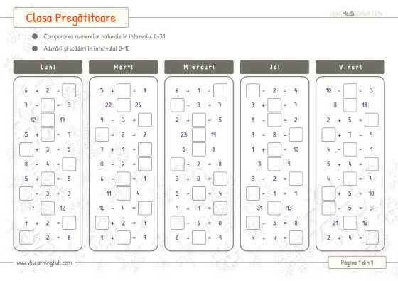 Clasa Pregătitoare. Numere naturale 0-31. Adunări și Scăderi 0-10.