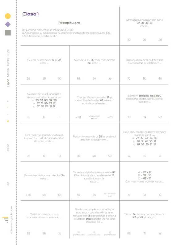 Clasa 1. Matematică. Recapitulare. Numere naturale, adunări și scăderi 0-100, fără trecere peste ordin.