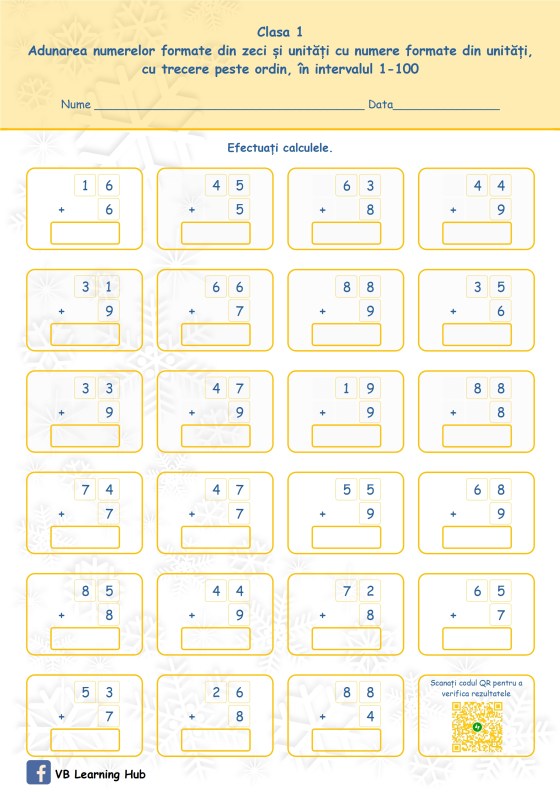 Clasa I. Adunarea numerelor formate din zeci și unități cu numere formate din unități, cu trecere peste ordin, în intervalul 1-100.
