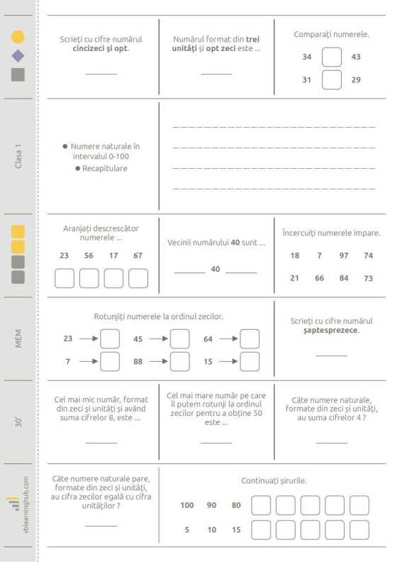 Clasa 1. Numere naturale 0-100. Fișa de lucru. Recapitulare.