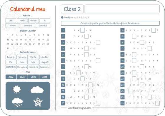Clasa 2. Fișă de lucru. Înmulțirea cu 0, 1, 2, 3, 4, 5.