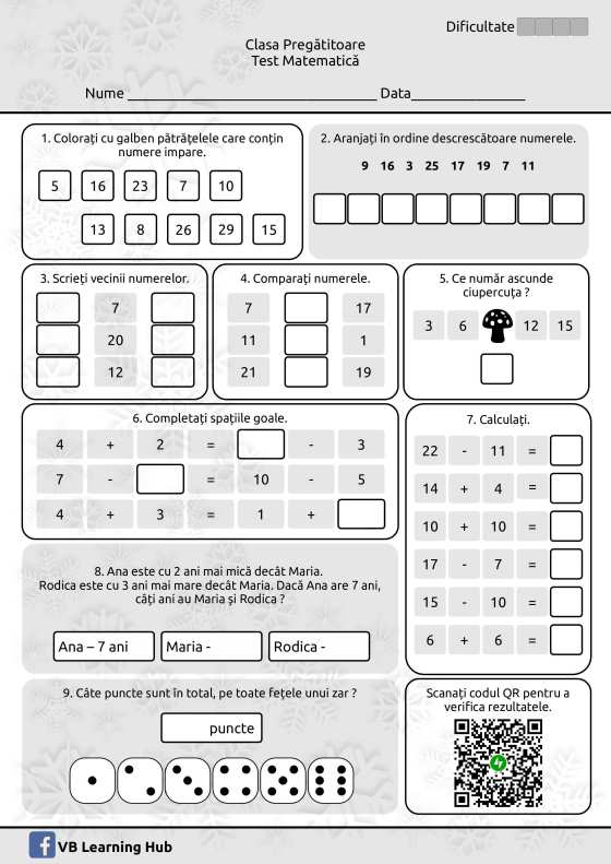 Clasa Pregătitoare. Test Matematică. Recapitulare.